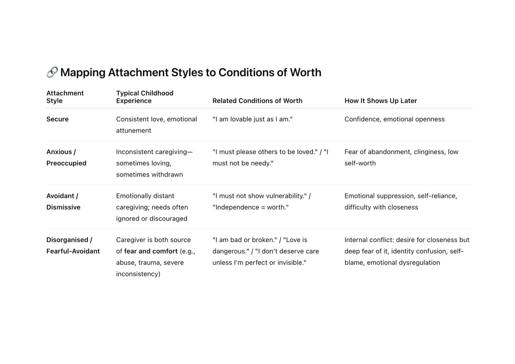 In her work, Emma Tickle shares that attachment styles and conditions of worth are essentially reflecting the same process. I have extended upon Tickle’s work to include disorganised (or fearful/avoidant) attachment. An idea of how attachment styles might map to conditions of worth, as well as how these might show up on our adult life, can be seen below: